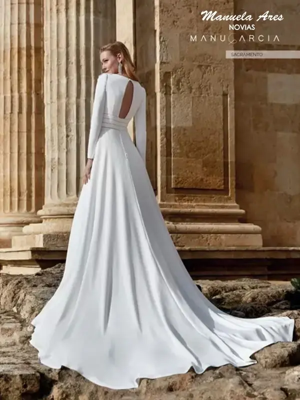 La sencillez y la elegancia se funden en este vestido para garantizar a la novia la comodidad en su gran día. Este maravilloso diseño de línea evasé, que dibuja la silueta y que combina a la perfección con el escote barco, es ideal para un pecho voluminoso. La manga es pegada y la espalda abierta en forma de lágrima. Destacan los sutiles adornos en el vestido, como son el detalle de vainica en la cintura y la flor de cristal del hombro.