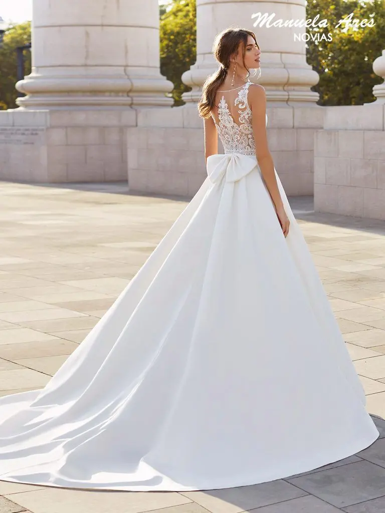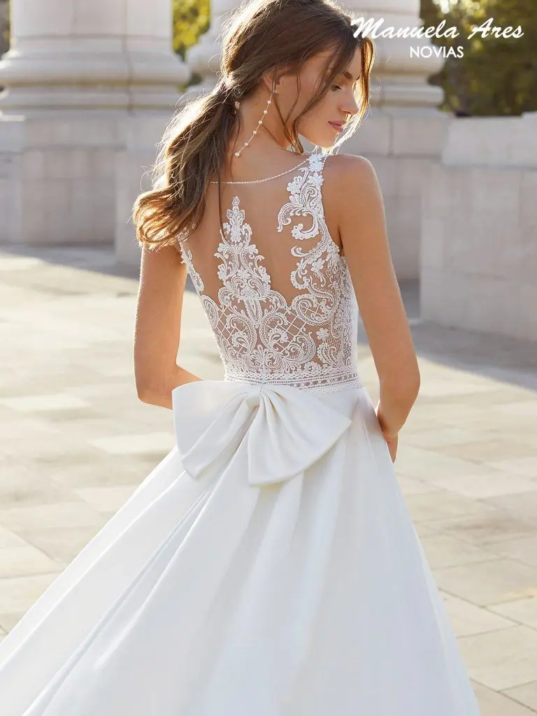 Vestido de novia estilo clásico de raso, encaje y pedrería. Escote barco y espalda transparente de encaje pedrería y lazo.