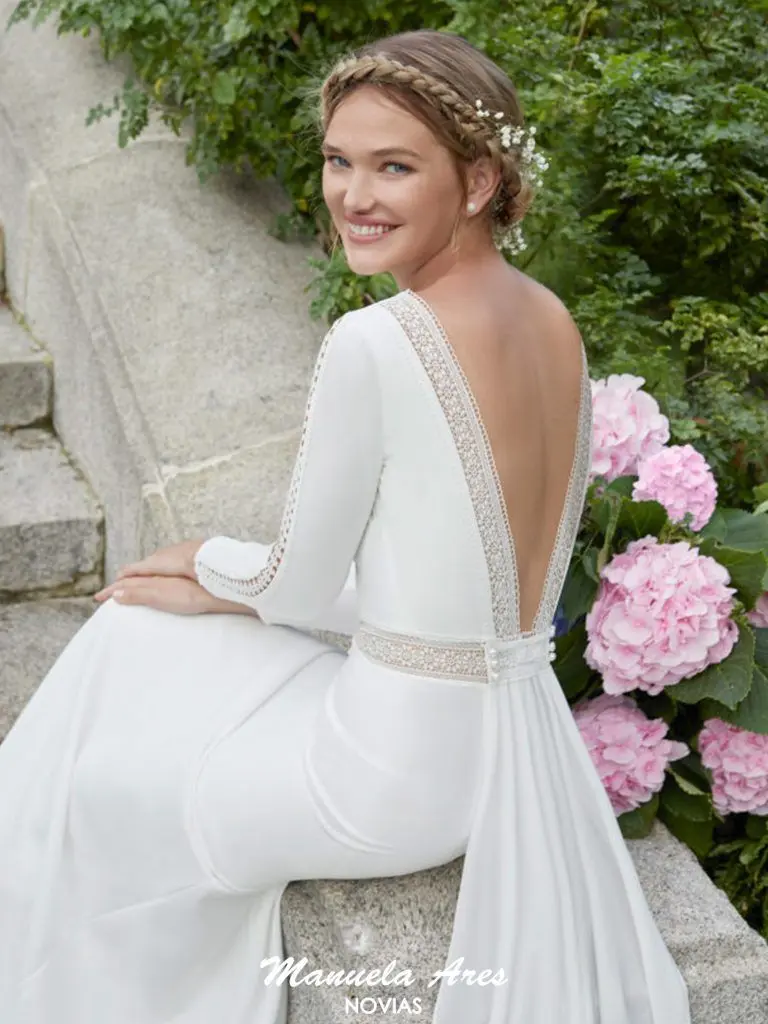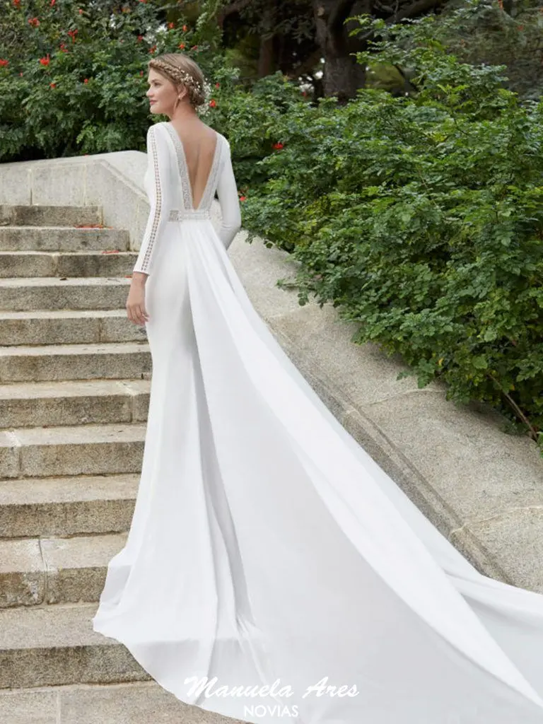 Vestido de novia corte recto de crepe con puntilla de encaje. Escote barco con manga larga y espalda escotada con cola extraíble.