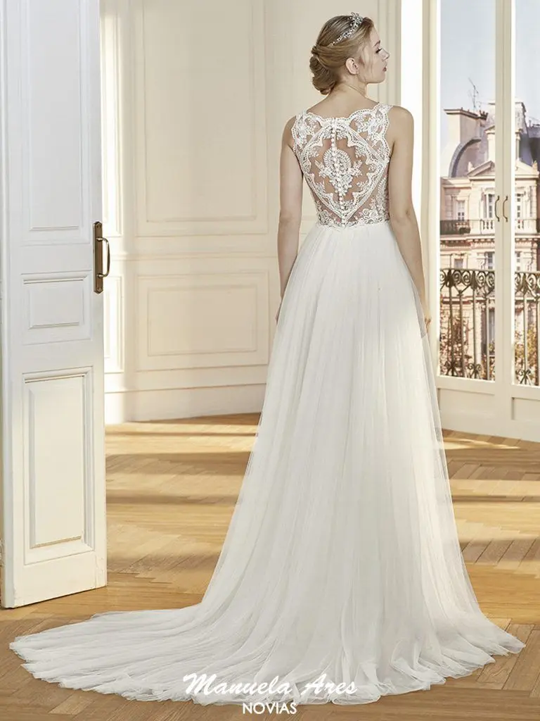 El movimiento del tul en la falda evasé contrastan con el cuerpo de encaje y cuello barco con transparencias, a juego con la espalda, que crea un efecto geométrico a partir de las aplicaciones.