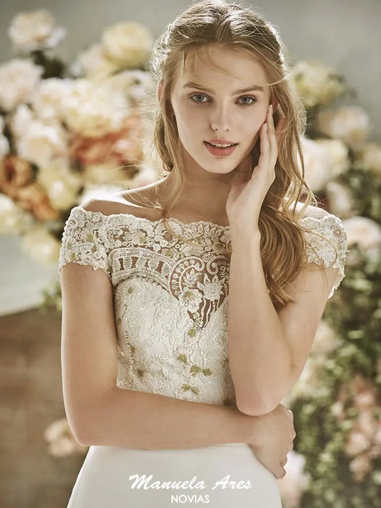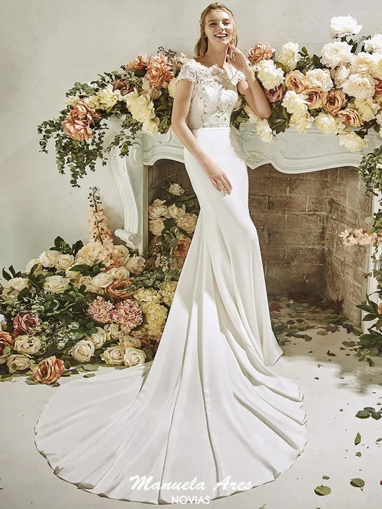 Vestido sirena de efecto dos piezas, con una elegante falda crepe y un sensual cuerpo de tul bordado con hilo bicolor y pedrería, y un favorecedor escote barco con manga corta y transparencias.