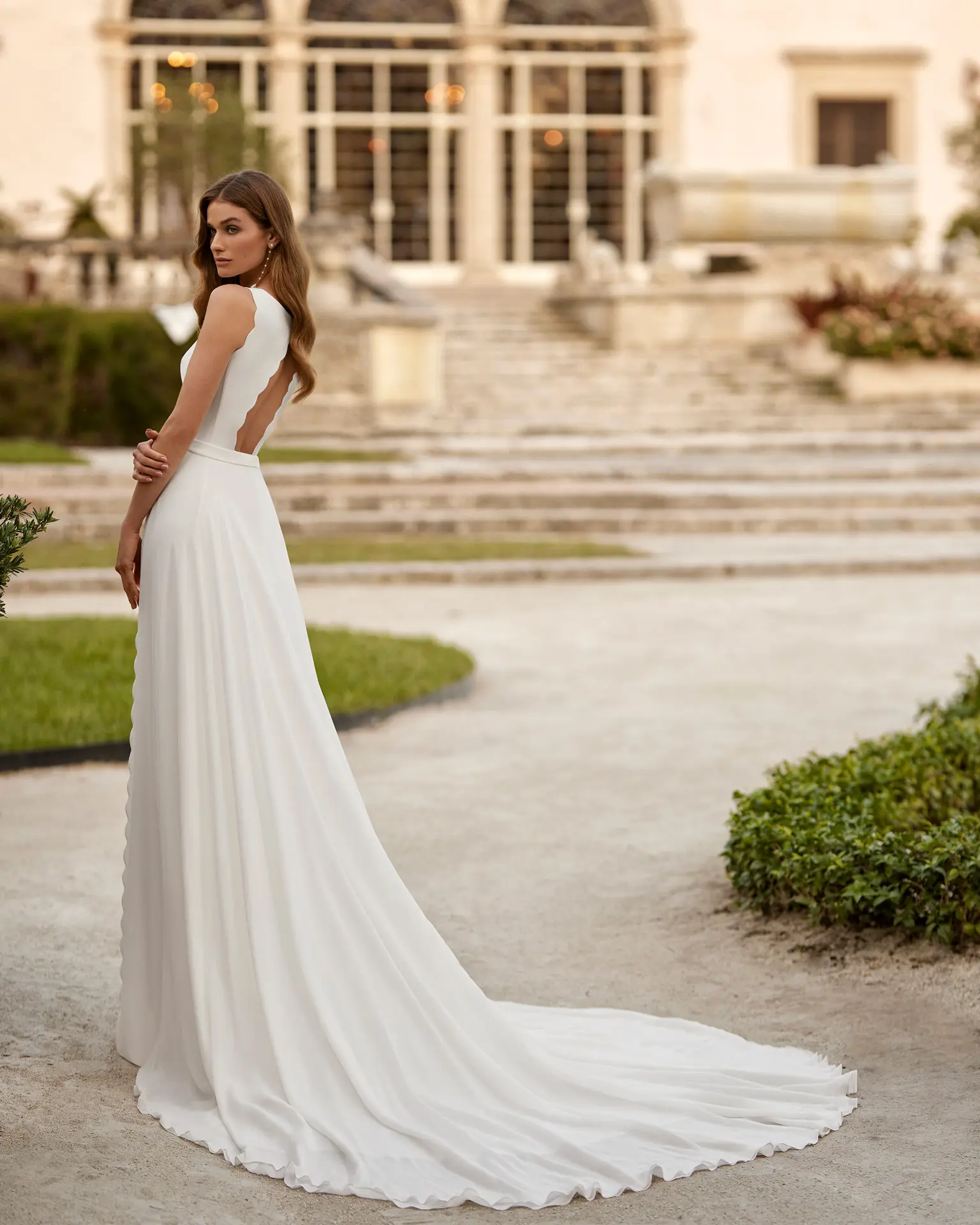 Vestido de novia de dos piezas, de corte sirena y estilo elegante, elaborado con crepé. Presenta un escote redondo, espalda abierta, sobrefalda y abertura lateral. Brilla con un outfit único Aire Barcelona.