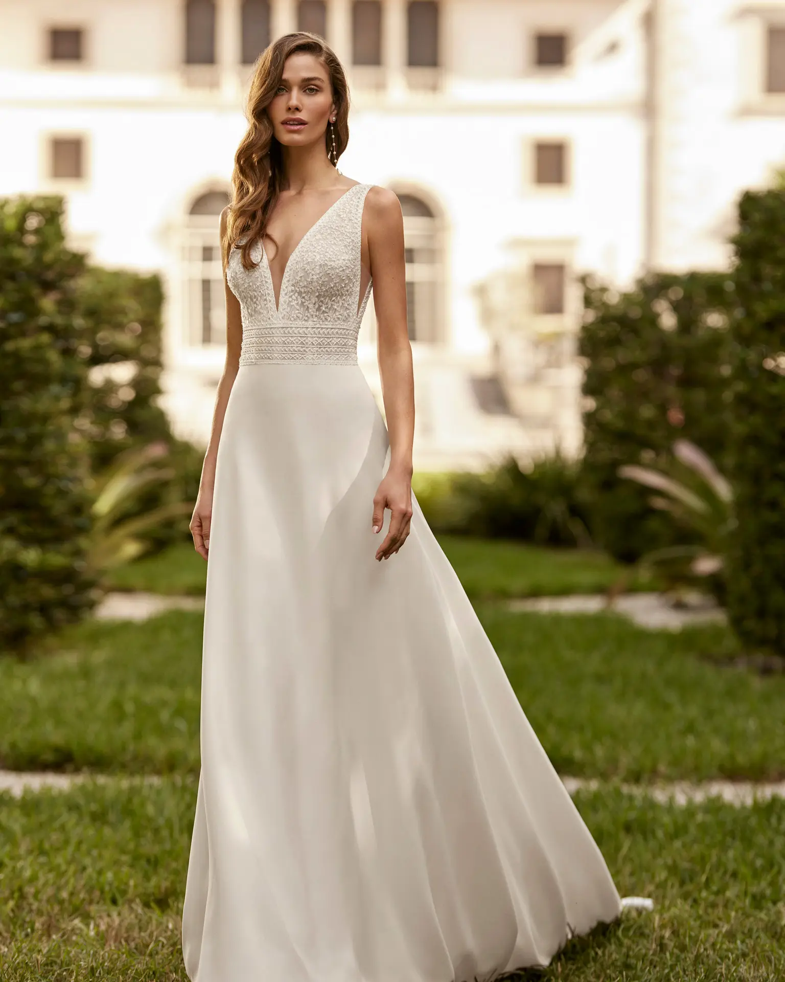 Vestido de novia línea A y estilo elegante, confeccionado en crepé combinado con encaje y pedrería. Con escote profundo y espalda en v, es uno de los trajes Aire Barcelona más delicados.