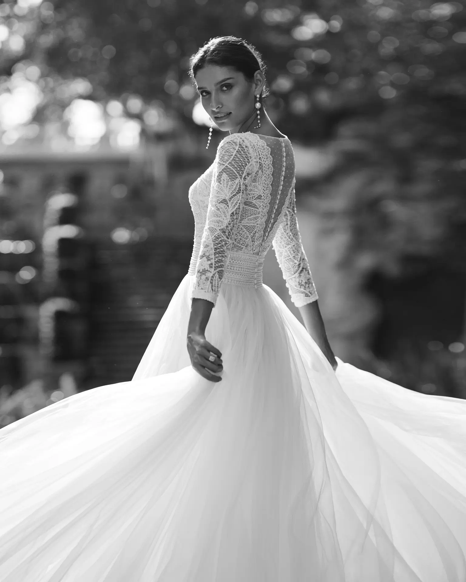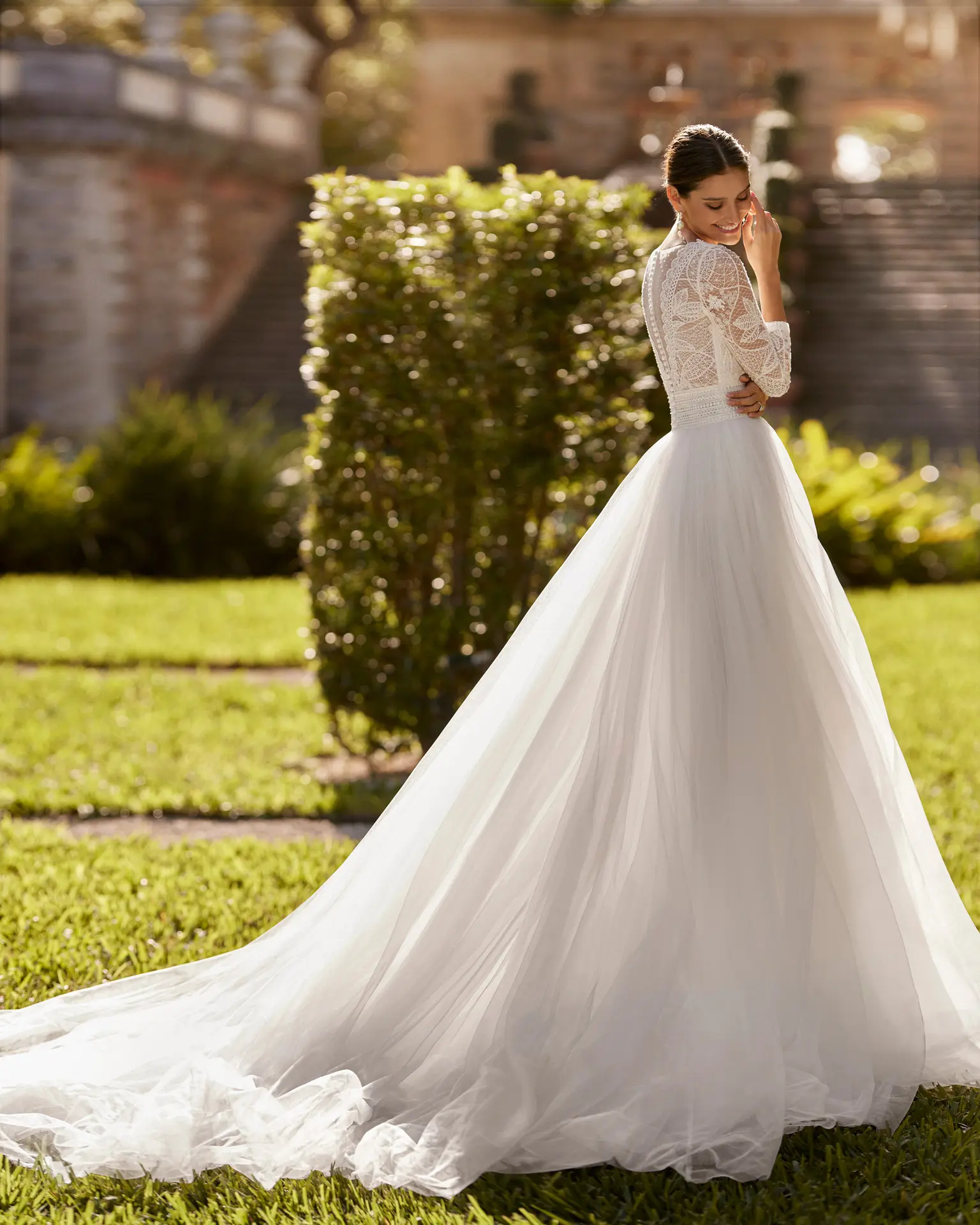 Vestido de novia de corte princesa y estilo romántico, confeccionado en tul suave combinado con encaje y pedrería. Con escote profundo, espalda ilusión y manga francesa, este conjunto de ensueño Aire Barcelona te hará sentir especial.