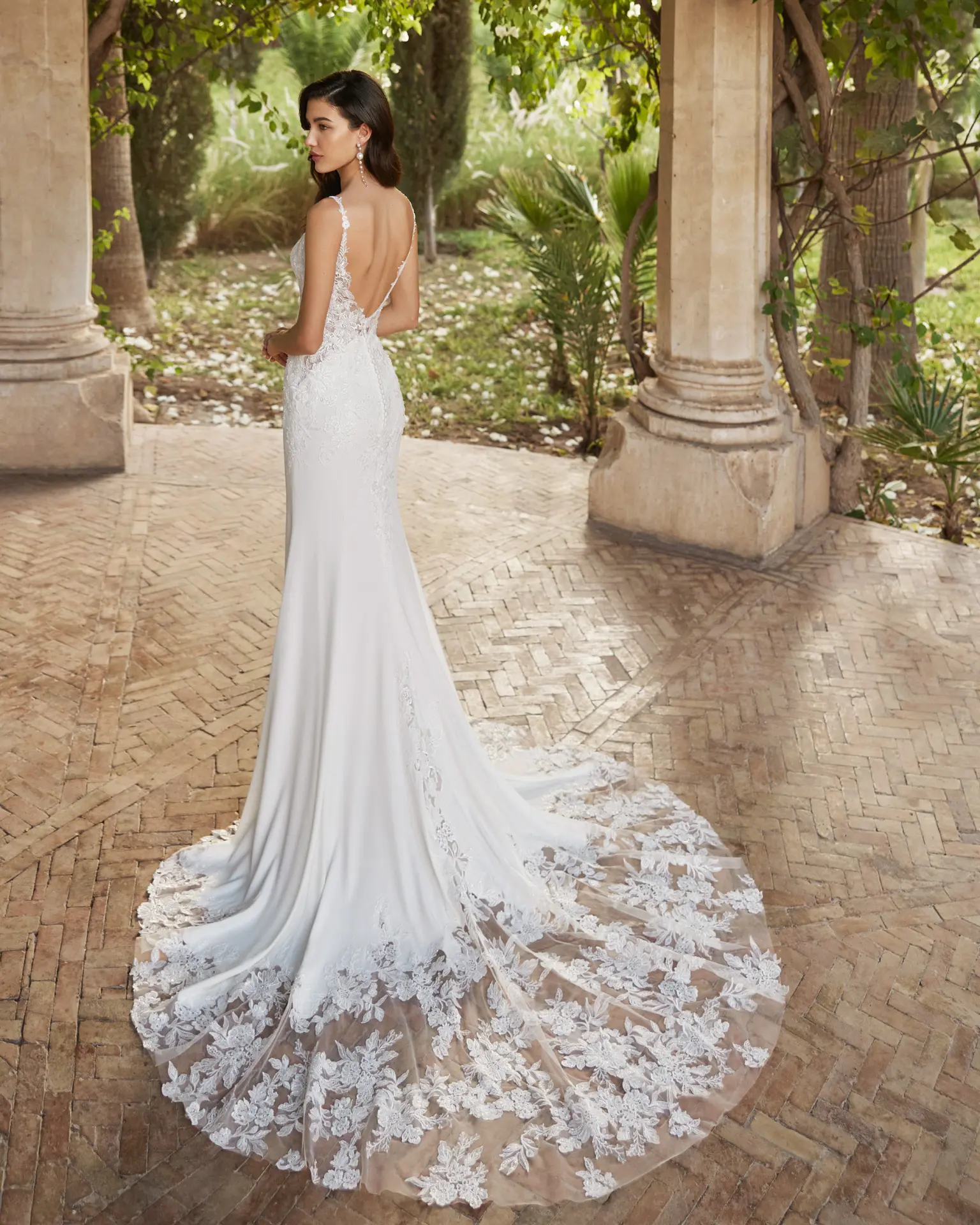 Vestido de novia de corte sirena y estilo sexy, elaborado con crepé y combinado con encaje y pedrería. Con escote en V, espalda descubierta y tirantes, este look Adriana Alier es de ensueño.
