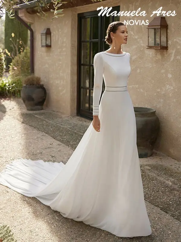 Destaca tu figura con el ligero vestido Garea, un modelo con silueta en línea A y escote barco, idóneo para una boda religiosa en invierno. Su manga larga, la espalda descubierta y la falda de georgette presentan un estilo boho chic con el que deslumbrarás. Incorpora una cola extraíble.