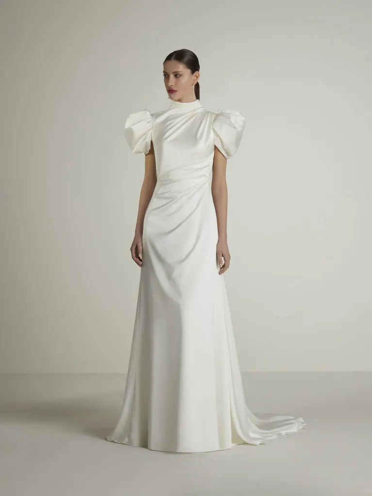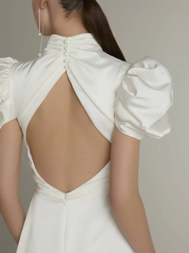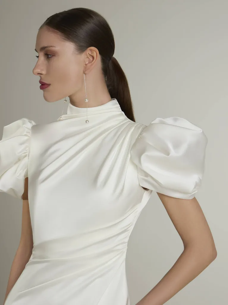 El modelo AZZURA enamora con un diseño que desprende glamour y sofisticación. Confeccionado en un lujoso tejido de raso stretch que se adapta a la figura, en su diseño de corte en A destacan llamativos detalles como el cuello cisne, los favorecedores toques drapeados, las elegantes mangas abullonadas y la sugerente abertura geométrica que adorna la espalda.
