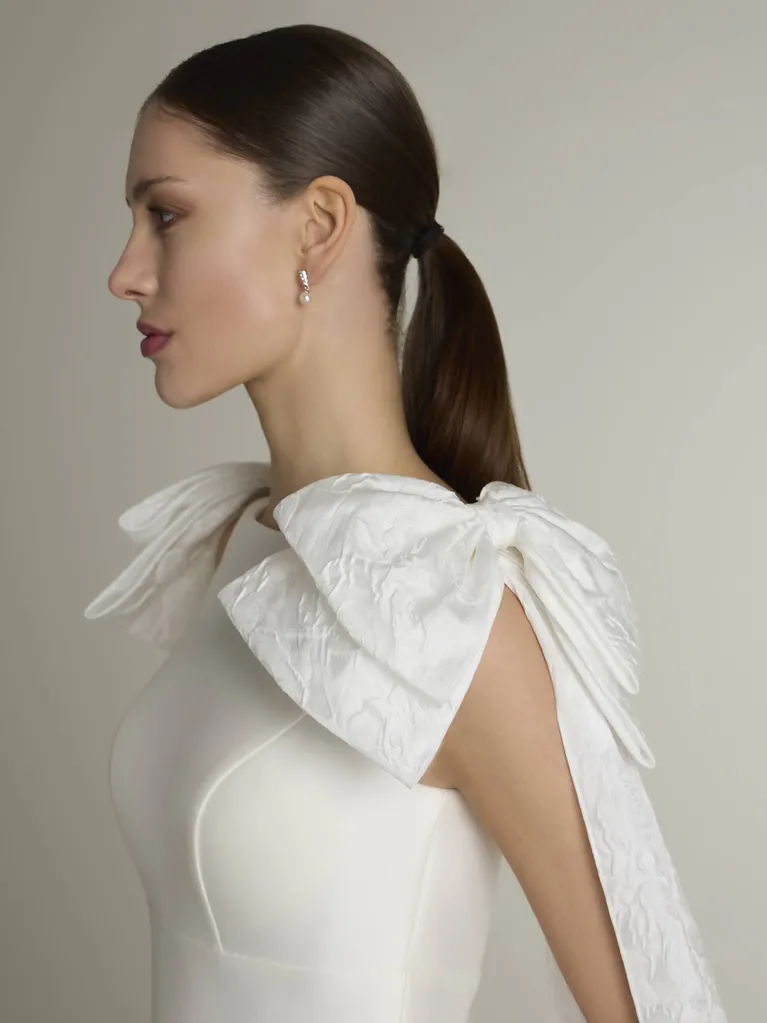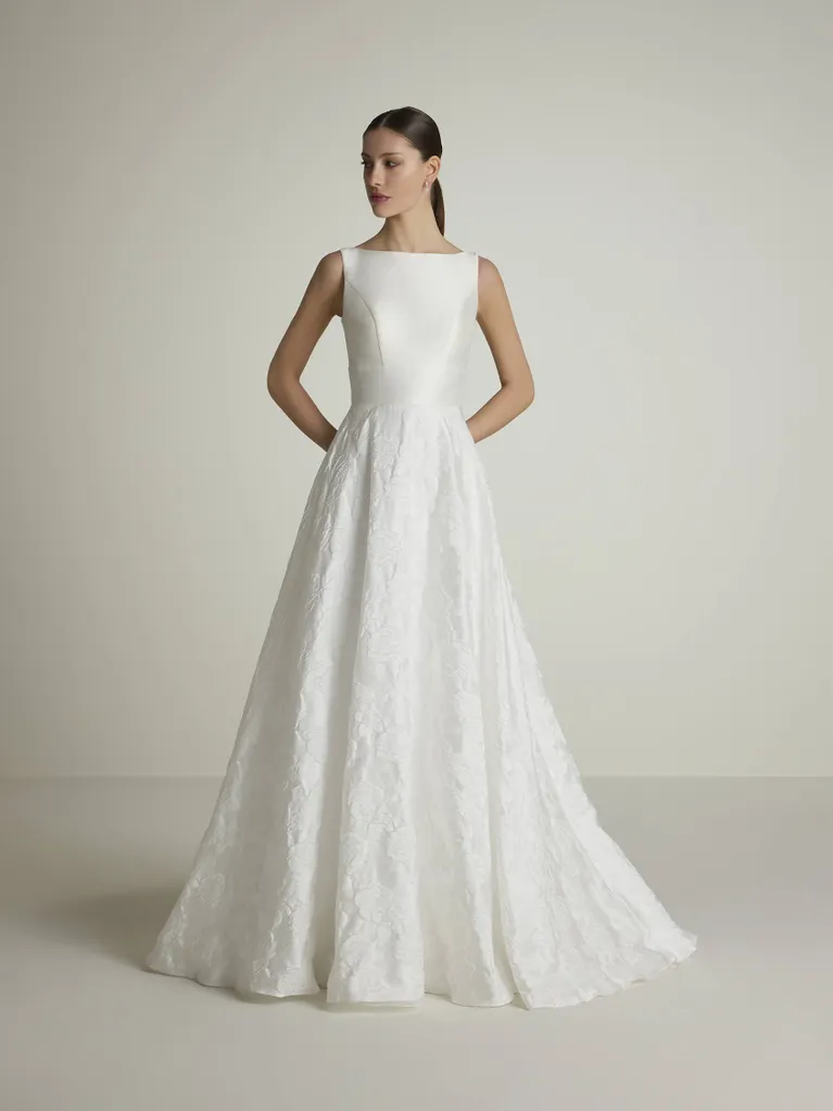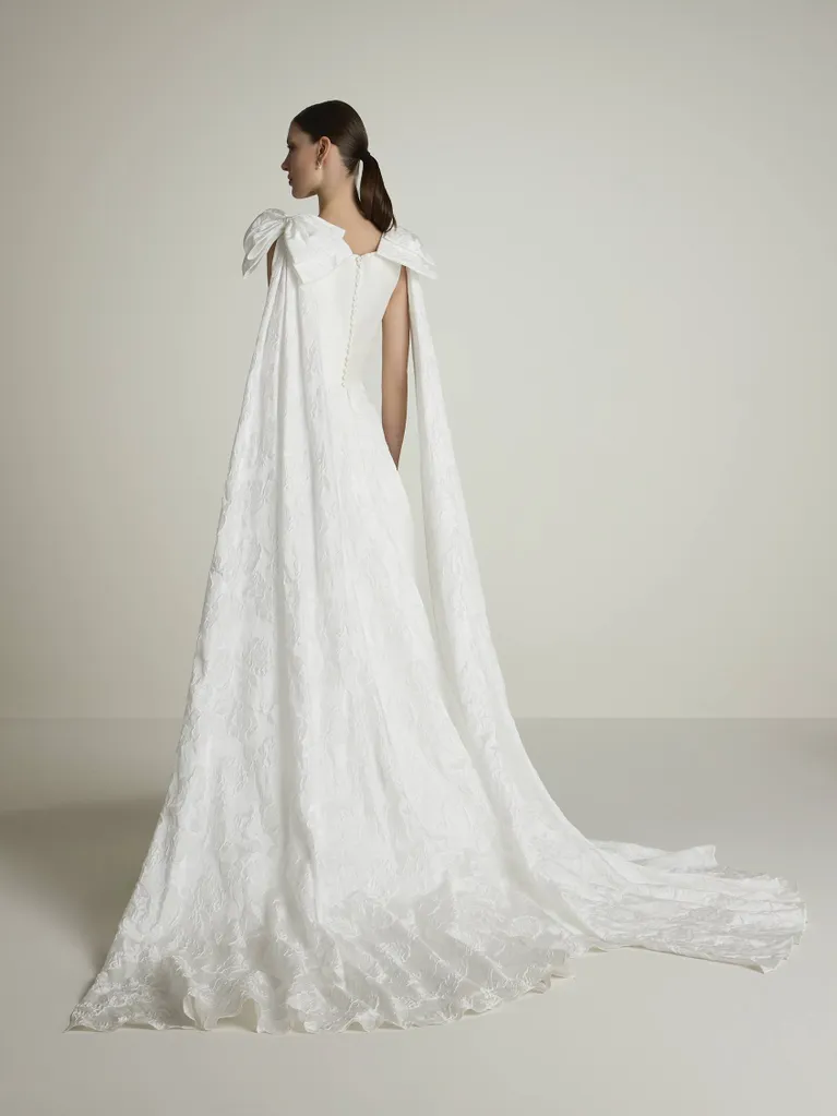 confeccionado en tejido de jacquard, presenta un diseño de corte en A con corpiño liso y motivos florales en una falda que cae sobre la silueta para ofrecer un acabado realmente favorecedor. Asimismo, cuenta con un espectacular detalle de lazos desmontables que se pueden enganchar en los hombros para crear un efecto realmente sorprendente.