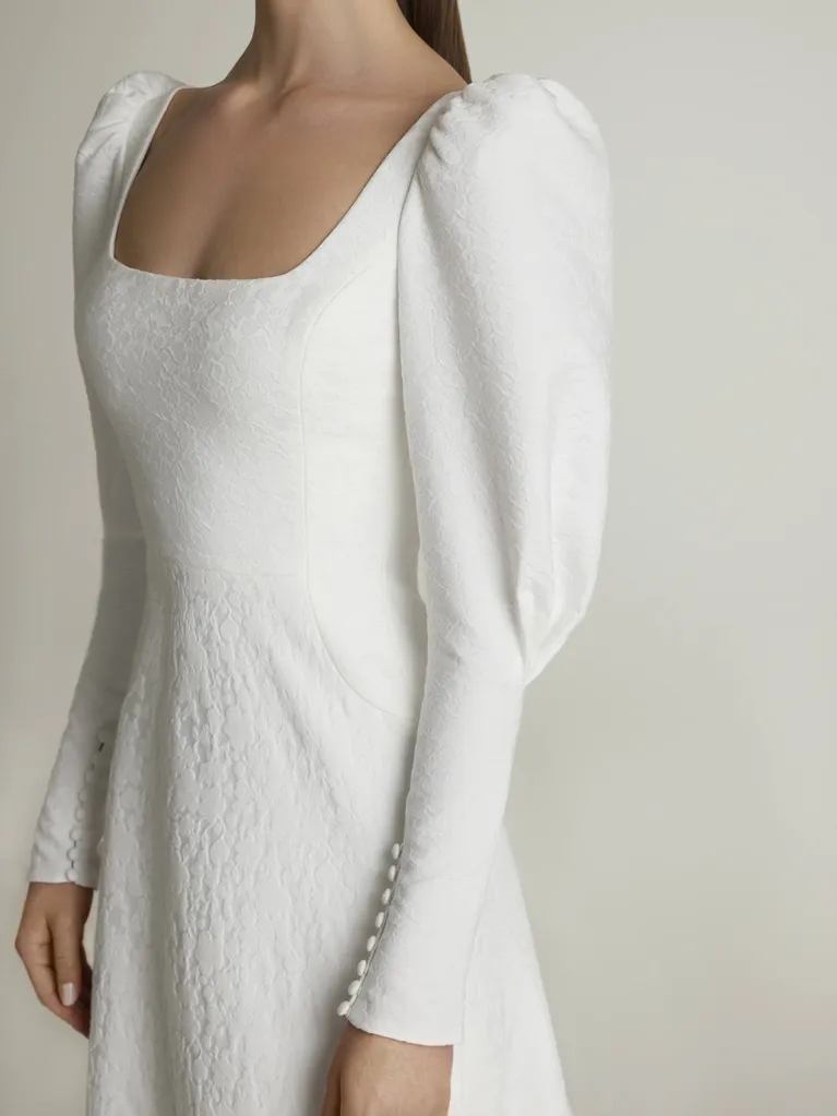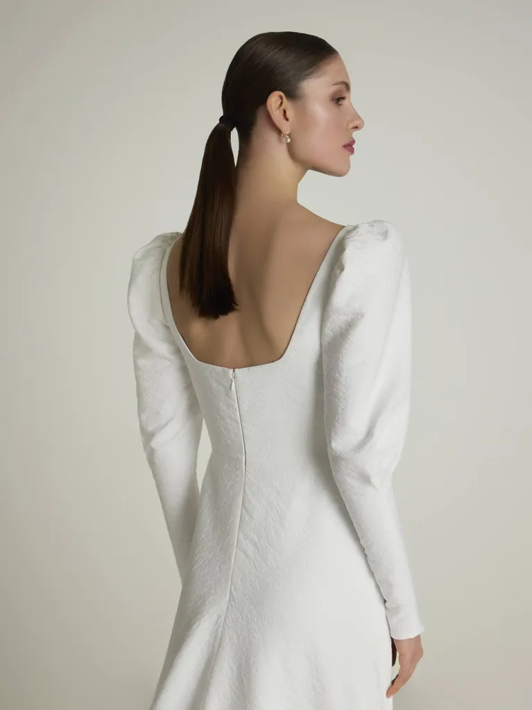 Ideal para las novias que celebran su boda durante los meses más fríos. Su diseño de corte en A totalmente confeccionado en jacquard presenta un escote cuadrado en la parte delantera y en la parte trasera, así como unas elegantes mangas de estilo abullonado que se estrechan en la zona del antebrazo adornadas con exquisitos detalles de botones.