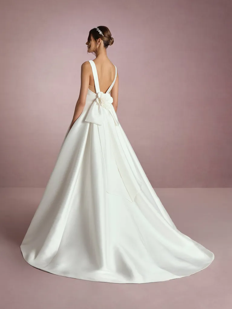 Diseño sencillo y delicado. Confeccionado en clásico mikado, cuenta con un escote en pico pronunciado y tirantes anchos que recorren toda la espalda hasta llegar a un gran lazo que adorna la parte posterior de la cinturilla ajustada. La falda, lisa al igual que el resto del diseño, presenta un corte en A que favorece a todas las figuras y aporta un aire soñador al modelo.