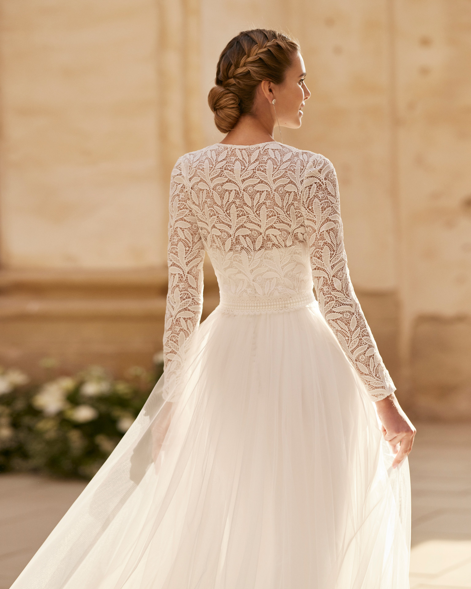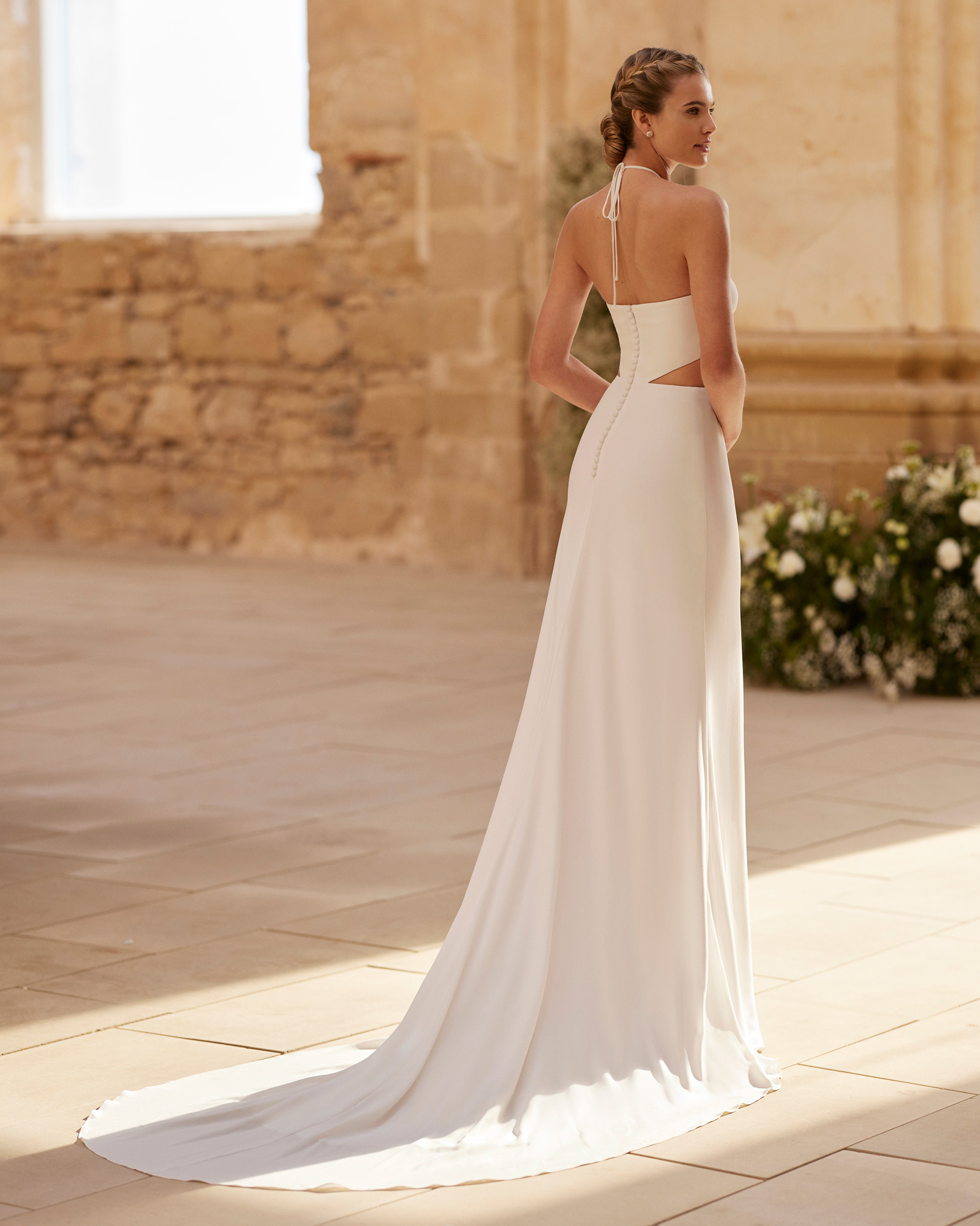 Vestido de novia largo de dos piezas, con silueta en línea A y estilo moderno. Elaborado con crepé fino y espalda descubierta, combina de maravilla con un abrigo de encaje y tul. Luce este exclusivo conjunto Alma Novia.
