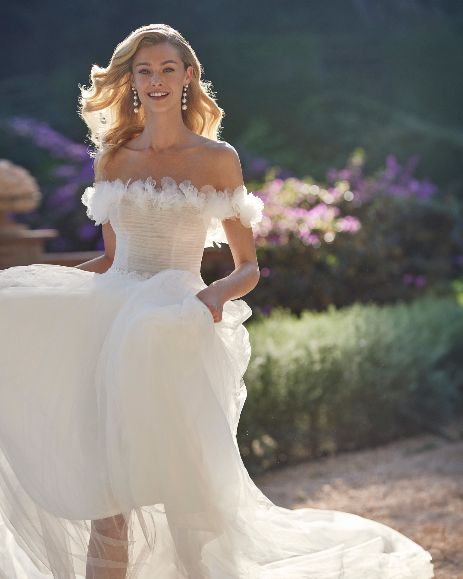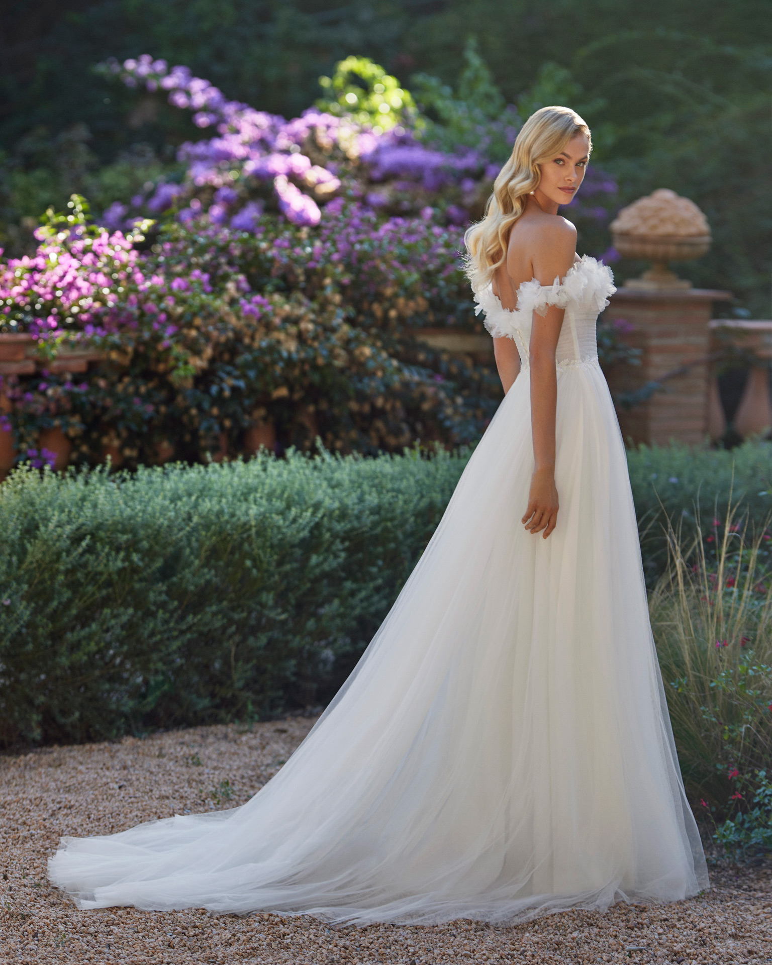 Vestido de novia de corte recto y estilo romántico, confeccionado en tul. Se completa con un escote palabra de honor y tirantes caídos. Un traje de novia Adriana Alier.