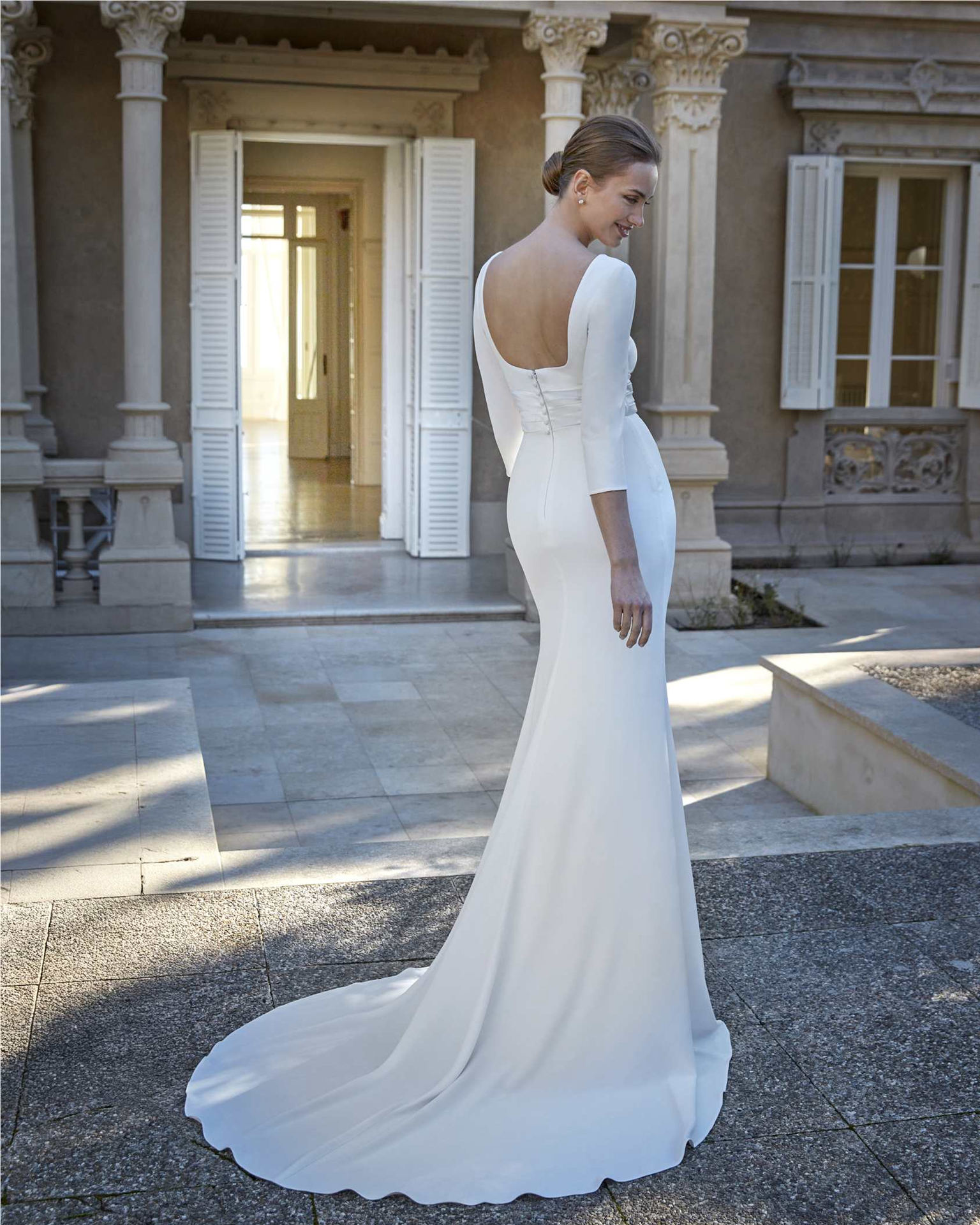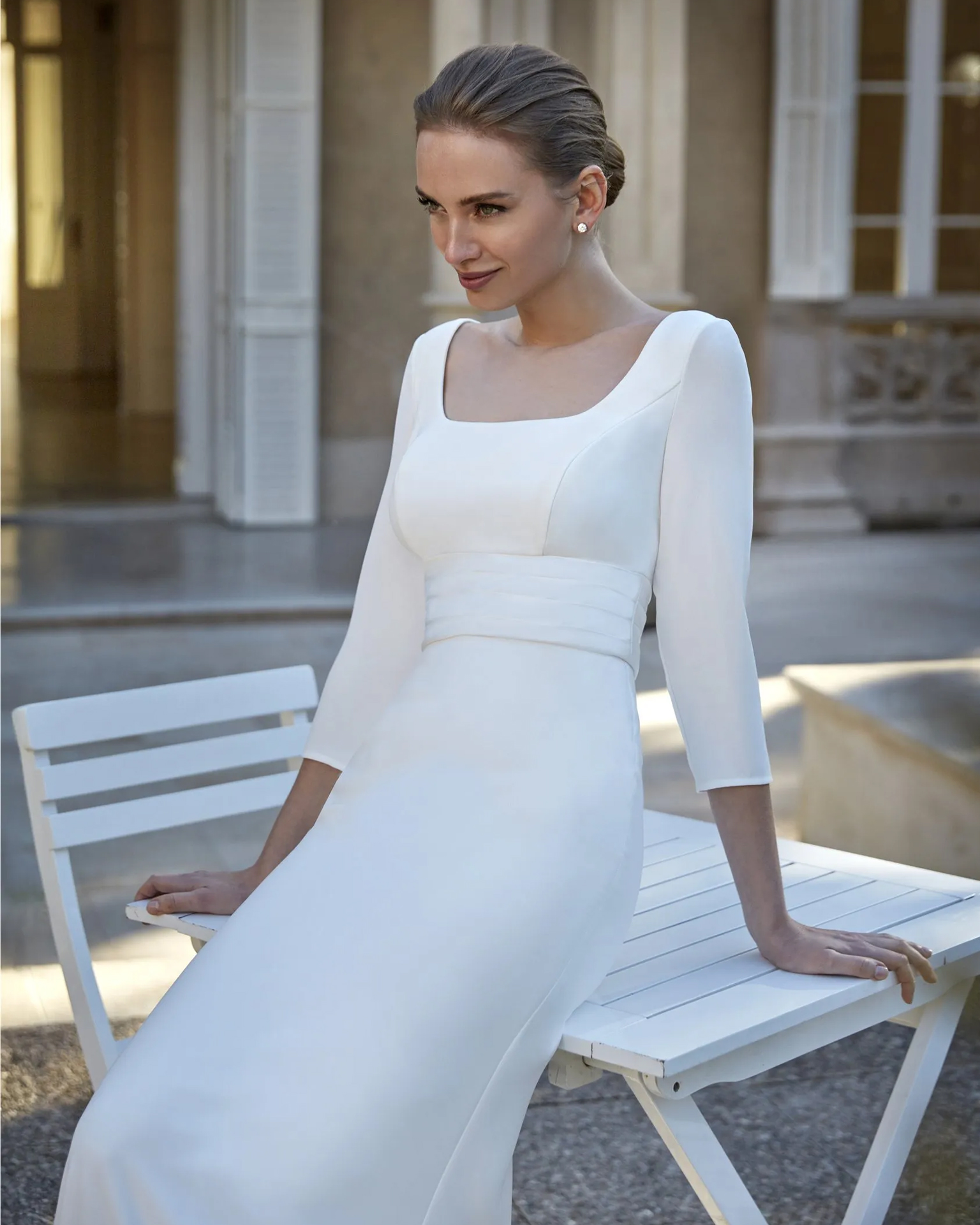 Este vestido sirena en crepé y satén con escote cuadrado y mangas tres cuartos es una opción refinada para una novia moderna.
