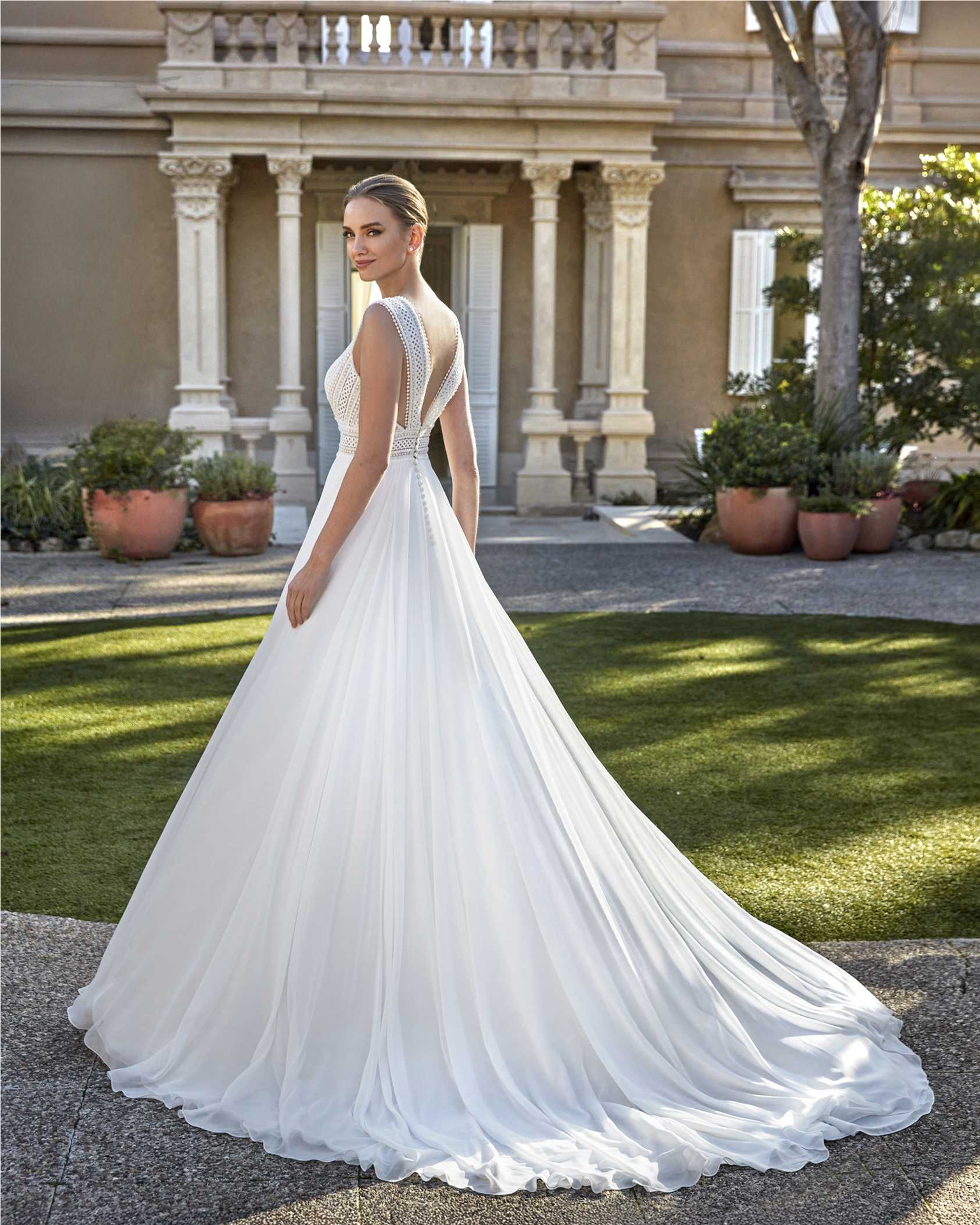 Vestido en chiffon con encaje y pedrería, de silueta en línea A. El escote barco y la espalda en pico aportan un equilibrio entre clasicismo y modernidad, ideal para una novia con gusto refinado.